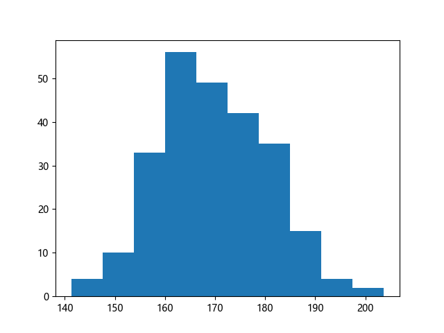 # 以下三行代码使编译器支持绘图功能: import sys import matplotlib matplotlib.use('Agg') import matplotlib.pyplot as plt import numpy as np # 生成正态分布数据: x = np.random.normal(170, 10, 250) # 均值 170,标准差 10,250 个数据点 # 绘制直方图: plt.hist(x) # 创建直方图 plt.show() # 显示图表 # 以下两行代码使编译器能够输出图形: plt.savefig(sys.stdout.buffer) sys.stdout.flush()