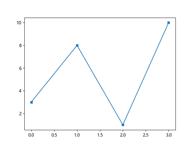 # 这三行代码使编译器能够绘图: import sys import matplotlib matplotlib.use('Agg') import matplotlib.pyplot as plt import numpy as np ypoints = np.array([3, 8, 1, 10]) # 使用加粗叉号标记绘制 plt.plot(ypoints, marker = 'X') plt.show() # 这两行代码使编译器能够输出图形: plt.savefig(sys.stdout.buffer) sys.stdout.flush()
