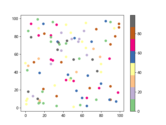 # 这三行代码使编译器能够绘图: import sys import matplotlib matplotlib.use('Agg') import matplotlib.pyplot as plt import numpy as np x = np.random.randint(100, size=(100)) y = np.random.randint(100, size=(100)) colors = np.random.randint(100, size=(100)) # 使用强调色系绘制散点图: plt.scatter(x, y, c=colors, cmap='Accent') plt.colorbar() plt.show() # 这两行代码使编译器能够输出图形: plt.savefig(sys.stdout.buffer) sys.stdout.flush()