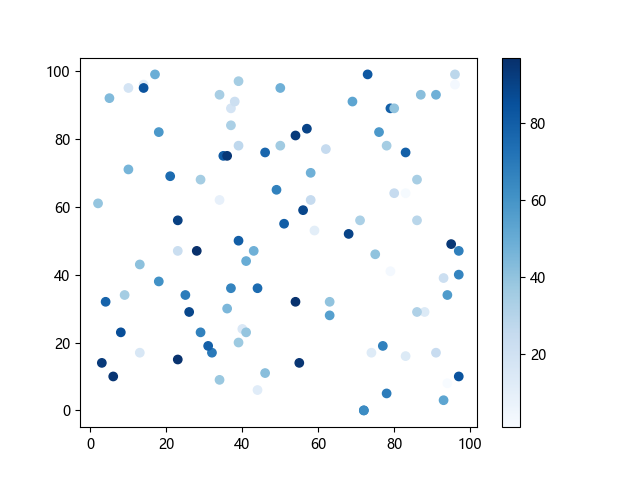 # 这三行代码使编译器能够绘图: import sys import matplotlib matplotlib.use('Agg') import matplotlib.pyplot as plt import numpy as np x = np.random.randint(100, size=(100)) y = np.random.randint(100, size=(100)) colors = np.random.randint(100, size=(100)) # 使用蓝色渐变绘制散点图: plt.scatter(x, y, c=colors, cmap='Blues') plt.colorbar() # 显示颜色条 plt.show() # 显示图形 # 这两行代码使编译器能够输出图形: plt.savefig(sys.stdout.buffer) sys.stdout.flush()