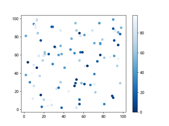 # 这三行代码使编译器能够绘图: import sys import matplotlib matplotlib.use('Agg') import matplotlib.pyplot as plt import numpy as np x = np.random.randint(100, size=(100)) y = np.random.randint(100, size=(100)) colors = np.random.randint(100, size=(100)) # 使用反向蓝色渐变绘制散点图: plt.scatter(x, y, c=colors, cmap='Blues_r') plt.colorbar() # 显示颜色条 plt.show() # 显示图形 # 这两行代码使编译器能够输出图形: plt.savefig(sys.stdout.buffer) sys.stdout.flush()