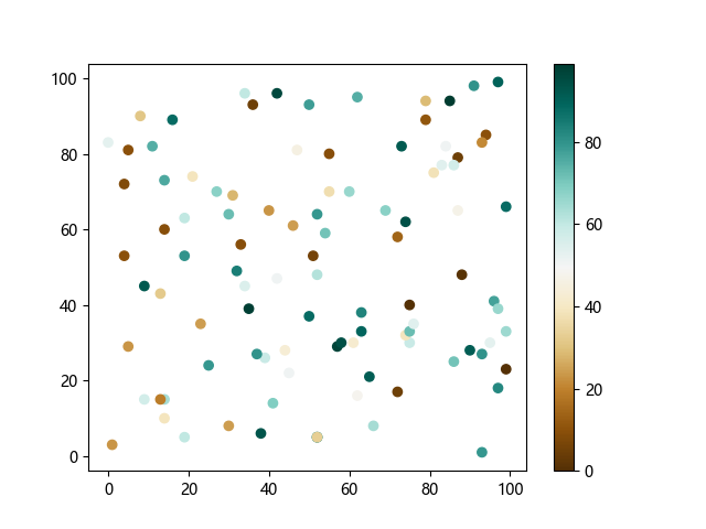 # 这三行代码使编译器能够绘图: import sys import matplotlib matplotlib.use('Agg') import matplotlib.pyplot as plt import numpy as np x = np.random.randint(100, size=(100)) y = np.random.randint(100, size=(100)) colors = np.random.randint(100, size=(100)) # 使用棕蓝绿渐变绘制散点图: plt.scatter(x, y, c=colors, cmap='BrBG') plt.colorbar() # 显示颜色条 plt.show() # 显示图形 # 这两行代码使编译器能够输出图形: plt.savefig(sys.stdout.buffer) sys.stdout.flush()