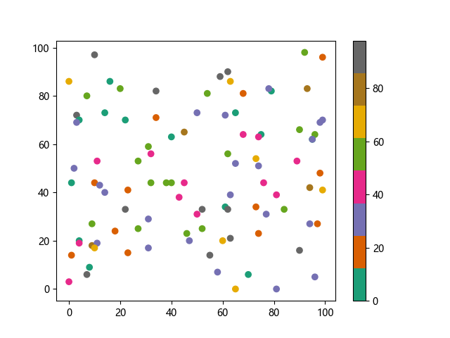 # 这三行代码使编译器能够绘图: import sys import matplotlib matplotlib.use('Agg') import matplotlib.pyplot as plt import numpy as np x = np.random.randint(100, size=(100)) y = np.random.randint(100, size=(100)) colors = np.random.randint(100, size=(100)) # 使用 Dark2 配色方案绘制散点图: plt.scatter(x, y, c=colors, cmap='Dark2') plt.colorbar() plt.show() # 这两行代码使编译器能够输出图形: plt.savefig(sys.stdout.buffer) sys.stdout.flush()
