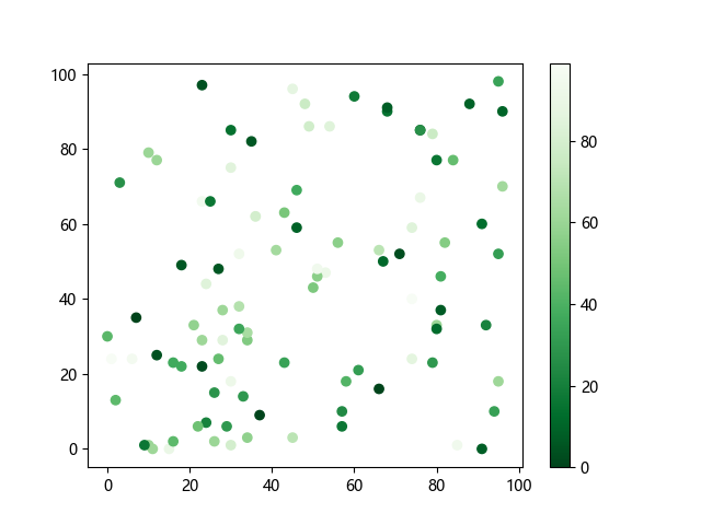 # 这三行代码使编译器能够绘图: import sys import matplotlib matplotlib.use('Agg') import matplotlib.pyplot as plt import numpy as np x = np.random.randint(100, size=(100)) y = np.random.randint(100, size=(100)) colors = np.random.randint(100, size=(100)) # 使用反向绿色渐变绘制散点图: plt.scatter(x, y, c=colors, cmap='Greens_r') plt.colorbar() plt.show() # 这两行代码使编译器能够输出图形: plt.savefig(sys.stdout.buffer) sys.stdout.flush()
