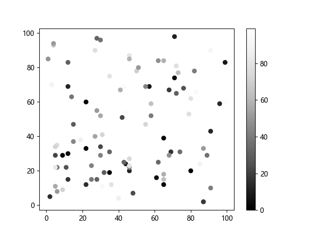 # 这三行代码使编译器能够绘图: import sys import matplotlib matplotlib.use('Agg') import matplotlib.pyplot as plt import numpy as np x = np.random.randint(100, size=(100)) y = np.random.randint(100, size=(100)) colors = np.random.randint(100, size=(100)) # 使用反向灰度渐变绘制散点图: plt.scatter(x, y, c=colors, cmap='Greys_r') plt.colorbar() plt.show() # 这两行代码使编译器能够输出图形: plt.savefig(sys.stdout.buffer) sys.stdout.flush()