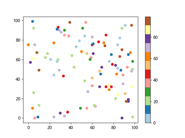 # 这三行代码使编译器能够绘图: import sys import matplotlib matplotlib.use('Agg') import matplotlib.pyplot as plt import numpy as np x = np.random.randint(100, size=(100)) y = np.random.randint(100, size=(100)) colors = np.random.randint(100, size=(100)) # 使用配对色系绘制散点图: plt.scatter(x, y, c=colors, cmap='Paired') plt.colorbar() plt.show() # 这两行代码使编译器能够输出图形: plt.savefig(sys.stdout.buffer) sys.stdout.flush()