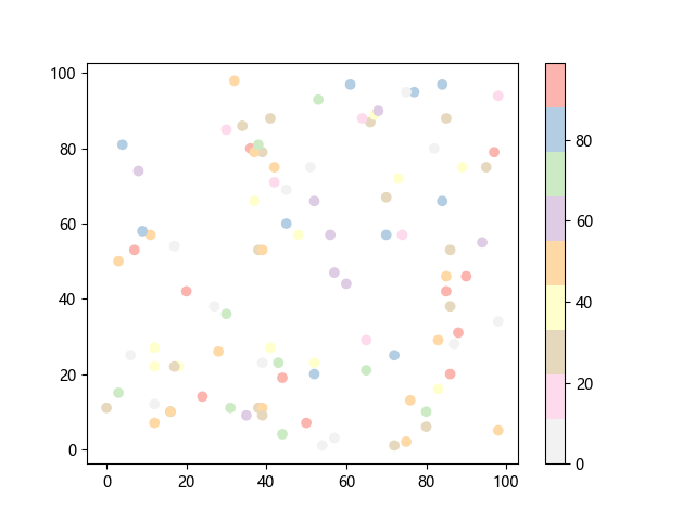 # 这三行代码使编译器能够绘图: import sys import matplotlib matplotlib.use('Agg') import matplotlib.pyplot as plt import numpy as np x = np.random.randint(100, size=(100)) y = np.random.randint(100, size=(100)) colors = np.random.randint(100, size=(100)) # 绘制反向 Pastel1 配色方案的散点图: plt.scatter(x, y, c=colors, cmap='Pastel1_r') plt.colorbar() plt.show() # 这两行代码使编译器能够输出图形: plt.savefig(sys.stdout.buffer) sys.stdout.flush()