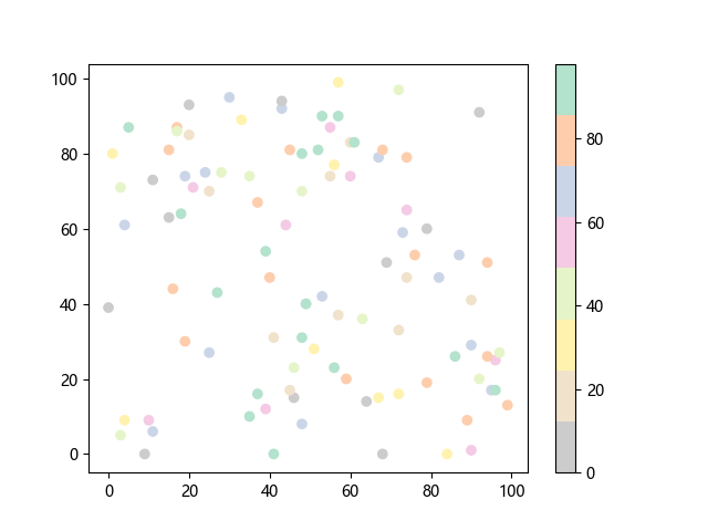 # 这三行代码使编译器能够绘图: import sys import matplotlib matplotlib.use('Agg') import matplotlib.pyplot as plt import numpy as np # 生成 100 个随机 x 坐标: x = np.random.randint(100, size=(100)) # 生成 100 个随机 y 坐标: y = np.random.randint(100, size=(100)) # 生成 100 个随机颜色值: colors = np.random.randint(100, size=(100)) # 绘制彩色散点图 plt.scatter(x, y, c=colors, cmap='Pastel2_r') plt.colorbar() # 显示颜色条 plt.show() # 显示图形 # 这两行代码使编译器能够输出图形: plt.savefig(sys.stdout.buffer) sys.stdout.flush()
