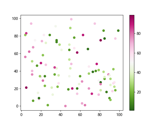 # 这三行代码使编译器能够绘图: import sys import matplotlib matplotlib.use('Agg') import matplotlib.pyplot as plt import numpy as np # 生成随机数据: x = np.random.randint(100, size=(100)) y = np.random.randint(100, size=(100)) colors = np.random.randint(100, size=(100)) # 使用 PiYG_r 配色方案绘制粉绿反向渐变色散点图: plt.scatter(x, y, c=colors, cmap='PiYG_r') plt.colorbar() # 显示颜色条 plt.show() # 显示图形 # 这两行代码使编译器能够输出图形: plt.savefig(sys.stdout.buffer) sys.stdout.flush()