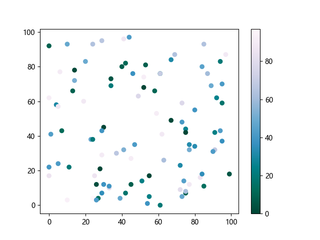 # 这三行代码使编译器能够绘图: import sys import matplotlib matplotlib.use('Agg') import matplotlib.pyplot as plt import numpy as np # 生成随机数据: x = np.random.randint(100, size=(100)) y = np.random.randint(100, size=(100)) colors = np.random.randint(100, size=(100)) # 使用 PuBuGn_r 配色方案绘制紫蓝绿反向渐变色散点图: plt.scatter(x, y, c=colors, cmap='PuBuGn_r') plt.colorbar() # 显示颜色条 plt.show() # 显示图形 # 这两行代码使编译器能够输出图形: plt.savefig(sys.stdout.buffer) sys.stdout.flush()