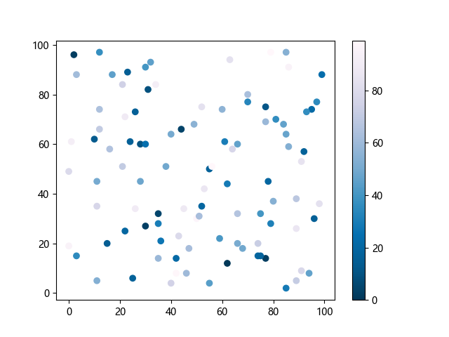 # 这三行代码使编译器能够绘图: import sys import matplotlib matplotlib.use('Agg') import matplotlib.pyplot as plt import numpy as np # 生成随机数据: x = np.random.randint(100, size=(100)) y = np.random.randint(100, size=(100)) colors = np.random.randint(100, size=(100)) # 使用 PuBu_r 配色方案绘制紫蓝色反向渐变色散点图: plt.scatter(x, y, c=colors, cmap='PuBu_r') plt.colorbar() # 显示颜色条 plt.show() # 显示图形 # 这两行代码使编译器能够输出图形: plt.savefig(sys.stdout.buffer) sys.stdout.flush()