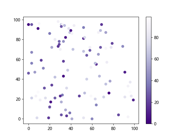 # 这三行代码使编译器能够绘图: import sys import matplotlib matplotlib.use('Agg') import matplotlib.pyplot as plt import numpy as np # 生成随机数据: x = np.random.randint(100, size=(100)) y = np.random.randint(100, size=(100)) colors = np.random.randint(100, size=(100)) # 使用 Purples_r 配色方案绘制紫色反向渐变色散点图: plt.scatter(x, y, c=colors, cmap='Purples_r') plt.colorbar() # 显示颜色条 plt.show() # 显示图形 # 这两行代码使编译器能够输出图形: plt.savefig(sys.stdout.buffer) sys.stdout.flush()