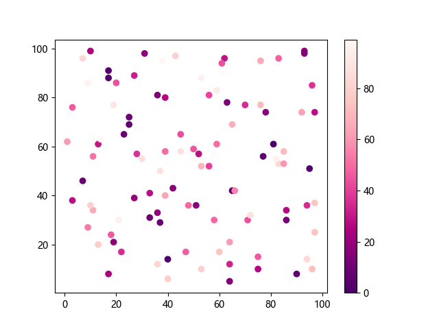 # 这三行代码使编译器能够绘图: import sys import matplotlib matplotlib.use('Agg') import matplotlib.pyplot as plt import numpy as np # 生成随机数据: x = np.random.randint(100, size=(100)) y = np.random.randint(100, size=(100)) colors = np.random.randint(100, size=(100)) # 使用 RdPu_r 配色方案绘制红紫色反向渐变色散点图: plt.scatter(x, y, c=colors, cmap='RdPu_r') plt.colorbar() # 显示颜色条 plt.show() # 显示图形 # 这两行代码使编译器能够输出图形: plt.savefig(sys.stdout.buffer) sys.stdout.flush()