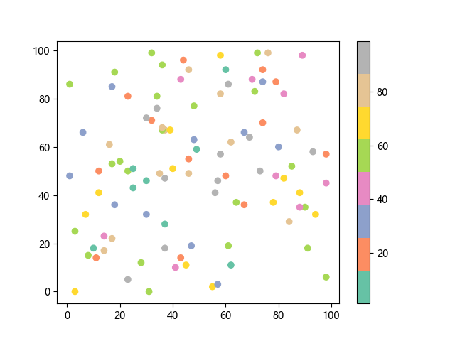 # 这三行代码使编译器能够绘图: import sys import matplotlib matplotlib.use('Agg') import matplotlib.pyplot as plt import numpy as np # 生成随机数据: x = np.random.randint(100, size=(100)) y = np.random.randint(100, size=(100)) colors = np.random.randint(100, size=(100)) # 使用 Set2 (8 色调色板)配色方案绘制 Set2 离散色散点图: plt.scatter(x, y, c=colors, cmap='Set2') plt.colorbar() # 显示颜色条 plt.show() # 显示图形 # 这两行代码使编译器能够输出图形: plt.savefig(sys.stdout.buffer) sys.stdout.flush()