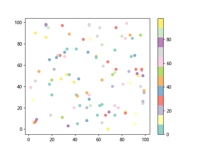 # 这三行代码使编译器能够绘图: import sys import matplotlib matplotlib.use('Agg') import matplotlib.pyplot as plt import numpy as np # 生成随机数据: x = np.random.randint(100, size=(100)) y = np.random.randint(100, size=(100)) colors = np.random.randint(100, size=(100)) # 使用 Set3 (12 色调色板)配色方案绘制 Set3 离散色散点图: plt.scatter(x, y, c=colors, cmap='Set3') plt.colorbar() # 显示颜色条 plt.show() # 显示图形 # 这两行代码使编译器能够输出图形: plt.savefig(sys.stdout.buffer) sys.stdout.flush()
