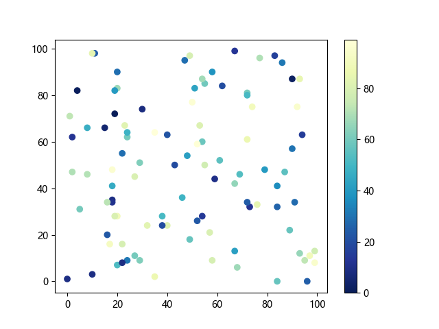 # 这三行代码使编译器能够绘图: import sys import matplotlib matplotlib.use('Agg') import matplotlib.pyplot as plt import numpy as np # 生成随机数据点: x = np.random.randint(100, size=(100)) y = np.random.randint(100, size=(100)) colors = np.random.randint(100, size=(100)) # 使用 YlGnBu_r (黄-绿-蓝反向渐变)配色方案绘制散点图: plt.scatter(x, y, c=colors, cmap='YlGnBu_r') plt.colorbar() # 显示颜色条 plt.show() # 显示图形 # 这两行代码使编译器能够输出图形: plt.savefig(sys.stdout.buffer) sys.stdout.flush()