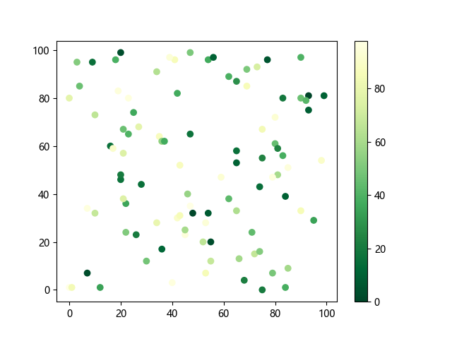 # 这三行代码使编译器能够绘图: import sys import matplotlib matplotlib.use('Agg') import matplotlib.pyplot as plt import numpy as np # 生成随机数据: x = np.random.randint(100, size=(100)) y = np.random.randint(100, size=(100)) colors = np.random.randint(100, size=(100)) # 使用YlGn_r(黄-绿反向渐变)配色方案绘制散点图: plt.scatter(x, y, c=colors, cmap='YlGn_r') plt.colorbar() # 显示颜色条 plt.show() # 显示图形 # 这两行代码使编译器能够输出图形: plt.savefig(sys.stdout.buffer) sys.stdout.flush()