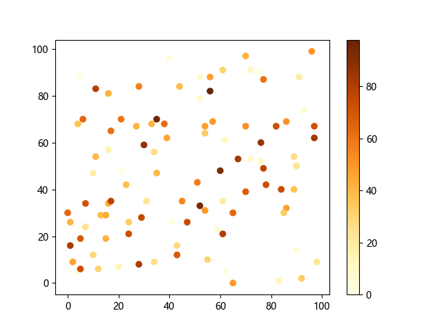 # 这三行代码使编译器能够绘图: import sys import matplotlib matplotlib.use('Agg') import matplotlib.pyplot as plt import numpy as np # 生成随机数据: x = np.random.randint(100, size=(100)) y = np.random.randint(100, size=(100)) colors = np.random.randint(100, size=(100)) # 使用 YlOrBr (黄-橙-棕渐变)配色方案绘制黄橙棕渐变散点图: plt.scatter(x, y, c=colors, cmap='YlOrBr') plt.colorbar() # 显示颜色条 plt.show() # 显示图形 # 这两行代码使编译器能够输出图形: plt.savefig(sys.stdout.buffer) sys.stdout.flush()