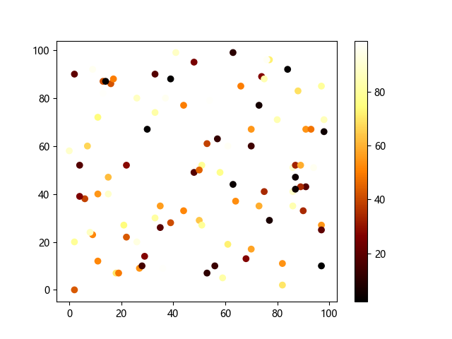 # 这三行代码使编译器能够绘图: import sys import matplotlib matplotlib.use('Agg') import matplotlib.pyplot as plt import numpy as np # 生成随机数据: x = np.random.randint(100, size=(100)) y = np.random.randint(100, size=(100)) colors = np.random.randint(100, size=(100)) # 使用 afmhot (热金属)配色方案绘制热金属色散点图: plt.scatter(x, y, c=colors, cmap='afmhot') plt.colorbar() # 显示颜色条 plt.show() # 显示图形 # 这两行代码使编译器能够输出图形: plt.savefig(sys.stdout.buffer) sys.stdout.flush()