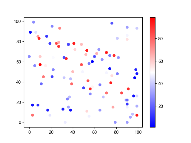# 这三行代码使编译器能够绘图: import sys import matplotlib matplotlib.use('Agg') import matplotlib.pyplot as plt import numpy as np # 生成随机数据 x = np.random.randint(100, size=(100)) y = np.random.randint(100, size=(100)) colors = np.random.randint(100, size=(100)) # 使用 bwr 配色方案绘制蓝白红渐变色散点图: plt.scatter(x, y, c=colors, cmap='bwr') plt.colorbar() plt.show() # 这两行代码使编译器能够输出图形: plt.savefig(sys.stdout.buffer) sys.stdout.flush()