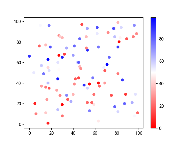 # 这三行代码使编译器能够绘图: import sys import matplotlib matplotlib.use('Agg') import matplotlib.pyplot as plt import numpy as np # 生成随机数据点 x = np.random.randint(100, size=(100)) y = np.random.randint(100, size=(100)) colors = np.random.randint(100, size=(100)) # 使用 bwr_r 配色方案绘制蓝白红反向渐变色散点图: plt.scatter(x, y, c=colors, cmap='bwr_r') plt.colorbar() plt.show() # 这两行代码使编译器能够输出图形: plt.savefig(sys.stdout.buffer) sys.stdout.flush()