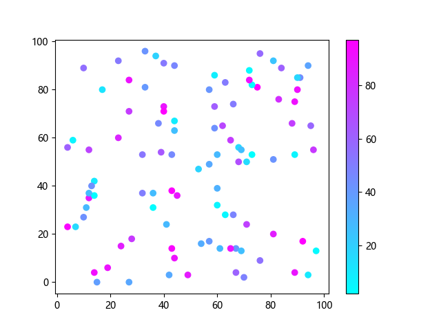 # 这三行代码使编译器能够绘图: import sys import matplotlib matplotlib.use('Agg') import matplotlib.pyplot as plt import numpy as np # 生成随机数据 x = np.random.randint(100, size=(100)) y = np.random.randint(100, size=(100)) colors = np.random.randint(100, size=(100)) # 使用 cool 配色方案绘制冷色调渐变色散点图: plt.scatter(x, y, c=colors, cmap='cool') plt.colorbar() plt.show() # 这两行代码使编译器能够输出图形: plt.savefig(sys.stdout.buffer) sys.stdout.flush()