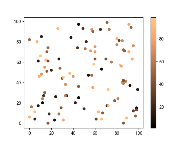 # 这三行代码使编译器能够绘图: import sys import matplotlib matplotlib.use('Agg') import matplotlib.pyplot as plt import numpy as np # 生成随机数据 x = np.random.randint(100, size=(100)) y = np.random.randint(100, size=(100)) colors = np.random.randint(100, size=(100)) # 使用 copper 配色方案绘制铜色渐变色散点图: plt.scatter(x, y, c=colors, cmap='copper') plt.colorbar() plt.show() # 这两行代码使编译器能够输出图形: plt.savefig(sys.stdout.buffer) sys.stdout.flush()