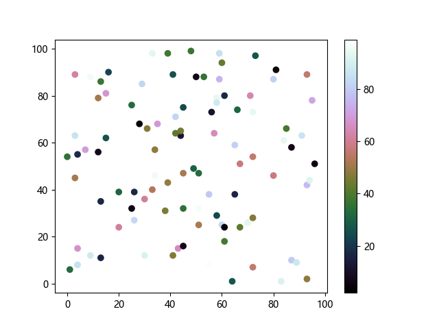 # 这三行代码使编译器能够绘图: import sys import matplotlib matplotlib.use('Agg') import matplotlib.pyplot as plt import numpy as np # 生成随机数据 x = np.random.randint(100, size=(100)) y = np.random.randint(100, size=(100)) colors = np.random.randint(100, size=(100)) # 使用 cubehelix 配色方案绘制螺旋立方体渐变色散点图: plt.scatter(x, y, c=colors, cmap='cubehelix') plt.colorbar() plt.show() # 这两行代码使编译器能够输出图形: plt.savefig(sys.stdout.buffer) sys.stdout.flush()