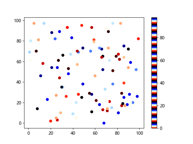 # 这三行代码使编译器能够绘图: import sys import matplotlib matplotlib.use('Agg') import matplotlib.pyplot as plt import numpy as np # 生成随机数据 x = np.random.randint(100, size=(100)) y = np.random.randint(100, size=(100)) colors = np.random.randint(100, size=(100)) # 使用 flag 配色方案绘制旗帜渐变色散点图: plt.scatter(x, y, c=colors, cmap='flag') plt.colorbar() plt.show() # 这两行代码使编译器能够输出图形: plt.savefig(sys.stdout.buffer) sys.stdout.flush()