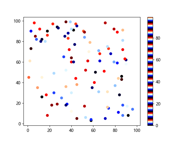 # 这三行代码使编译器能够绘图: import sys import matplotlib matplotlib.use('Agg') import matplotlib.pyplot as plt import numpy as np # 生成随机数据点 x = np.random.randint(100, size=(100)) y = np.random.randint(100, size=(100)) colors = np.random.randint(100, size=(100)) # 使用 flag_r 配色方案绘制旗帜反向渐变色散点图: plt.scatter(x, y, c=colors, cmap='flag_r') plt.colorbar() plt.show() # 这两行代码使编译器能够输出图形: plt.savefig(sys.stdout.buffer) sys.stdout.flush()