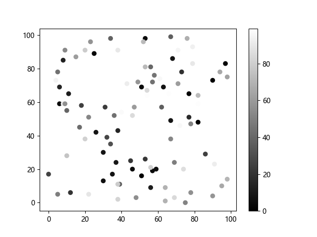 # 这三行代码使编译器能够绘图: import sys import matplotlib matplotlib.use('Agg') import matplotlib.pyplot as plt import numpy as np # 生成随机数据 x = np.random.randint(100, size=(100)) y = np.random.randint(100, size=(100)) colors = np.random.randint(100, size=(100)) # 使用 gist_gray 配色方案绘制灰度渐变色散点图: plt.scatter(x, y, c=colors, cmap='gist_gray') plt.colorbar() plt.show() # 这两行代码使编译器能够输出图形: plt.savefig(sys.stdout.buffer) sys.stdout.flush()