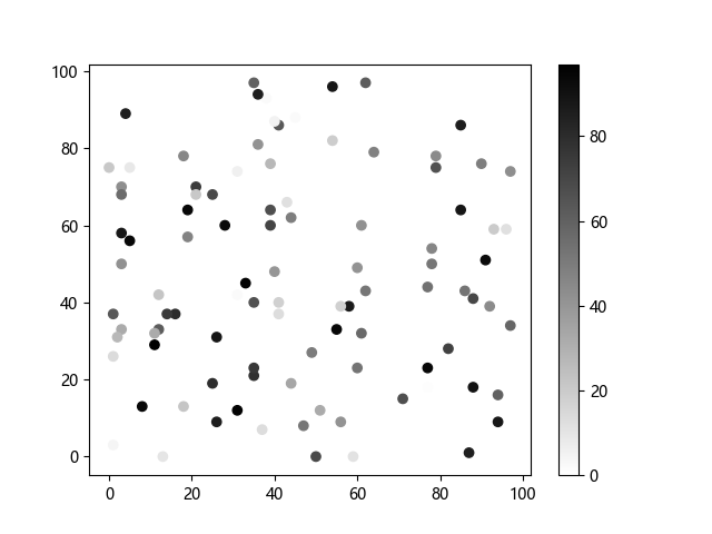 # 这三行代码使编译器能够绘图: import sys import matplotlib matplotlib.use('Agg') import matplotlib.pyplot as plt import numpy as np # 生成随机数据点 x = np.random.randint(100, size=(100)) y = np.random.randint(100, size=(100)) colors = np.random.randint(100, size=(100)) # 使用 gist_gray_r 配色方案绘制灰度反向渐变色散点图: plt.scatter(x, y, c=colors, cmap='gist_gray_r') plt.colorbar() plt.show() # 这两行代码使编译器能够输出图形: plt.savefig(sys.stdout.buffer) sys.stdout.flush()