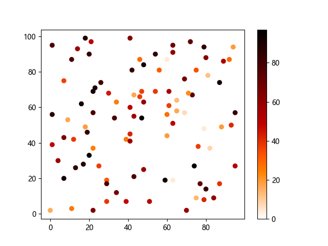 # 这三行代码使编译器能够绘图: import sys import matplotlib matplotlib.use('Agg') import matplotlib.pyplot as plt import numpy as np # 生成随机数据点 x = np.random.randint(100, size=(100)) y = np.random.randint(100, size=(100)) colors = np.random.randint(100, size=(100)) # 使用 gist_heat_r 配色方案绘制热力图反向渐变色散点图: plt.scatter(x, y, c=colors, cmap='gist_heat_r') plt.colorbar() plt.show() # 这两行代码使编译器能够输出图形: plt.savefig(sys.stdout.buffer) sys.stdout.flush()