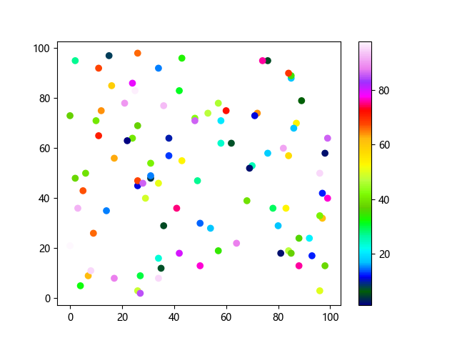 # 这三行代码使编译器能够绘图: import sys import matplotlib matplotlib.use('Agg') import matplotlib.pyplot as plt import numpy as np # 生成随机数据 x = np.random.randint(100, size=(100)) y = np.random.randint(100, size=(100)) colors = np.random.randint(100, size=(100)) # 使用 gist_ncar 配色方案绘制NCAR渐变色散点图: plt.scatter(x, y, c=colors, cmap='gist_ncar') plt.colorbar() plt.show() # 这两行代码使编译器能够输出图形: plt.savefig(sys.stdout.buffer) sys.stdout.flush()