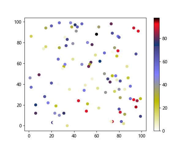 # 这三行代码使编译器能够绘图: import sys import matplotlib matplotlib.use('Agg') import matplotlib.pyplot as plt import numpy as np # 生成随机数据点 x = np.random.randint(100, size=(100)) y = np.random.randint(100, size=(100)) colors = np.random.randint(100, size=(100)) # 使用 gist_stern_r 配色方案绘制星云反向渐变色散点图: plt.scatter(x, y, c=colors, cmap='gist_stern_r') plt.colorbar() plt.show() # 这两行代码使编译器能够输出图形: plt.savefig(sys.stdout.buffer) sys.stdout.flush()