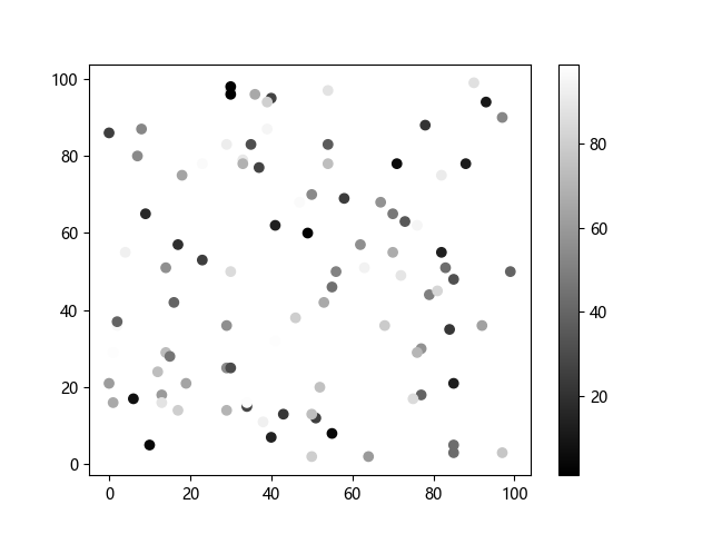 # 这三行代码使编译器能够绘图: import sys import matplotlib matplotlib.use('Agg') import matplotlib.pyplot as plt import numpy as np # 生成随机数据点 x = np.random.randint(100, size=(100)) y = np.random.randint(100, size=(100)) colors = np.random.randint(100, size=(100)) # 使用 gist_yarg_r 配色方案绘制灰度反向渐变色散点图: plt.scatter(x, y, c=colors, cmap='gist_yarg_r') plt.colorbar() plt.show() # 这两行代码使编译器能够输出图形: plt.savefig(sys.stdout.buffer) sys.stdout.flush()