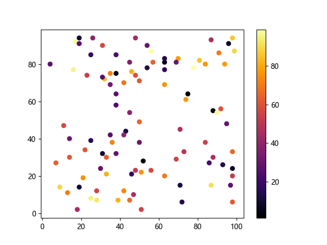 # 这三行代码使编译器能够绘图: import sys import matplotlib matplotlib.use('Agg') import matplotlib.pyplot as plt import numpy as np # 生成随机数据 x = np.random.randint(100, size=(100)) y = np.random.randint(100, size=(100)) colors = np.random.randint(100, size=(100)) # 使用 inferno 配色方案绘制地狱火渐变色散点图: plt.scatter(x, y, c=colors, cmap='inferno') plt.colorbar() plt.show() # 这两行代码使编译器能够输出图形: plt.savefig(sys.stdout.buffer) sys.stdout.flush()