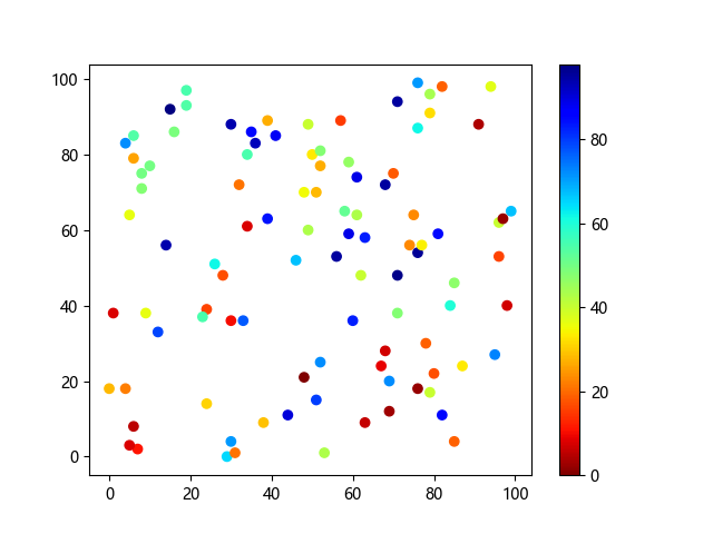 # 这三行代码使编译器能够绘图: import sys import matplotlib matplotlib.use('Agg') import matplotlib.pyplot as plt import numpy as np # 生成随机数据点 x = np.random.randint(100, size=(100)) y = np.random.randint(100, size=(100)) colors = np.random.randint(100, size=(100)) # 使用 jet_r 配色方案绘制 Jet 反向渐变色散点图: plt.scatter(x, y, c=colors, cmap='jet_r') plt.colorbar() plt.show() # 这两行代码使编译器能够输出图形: plt.savefig(sys.stdout.buffer) sys.stdout.flush()