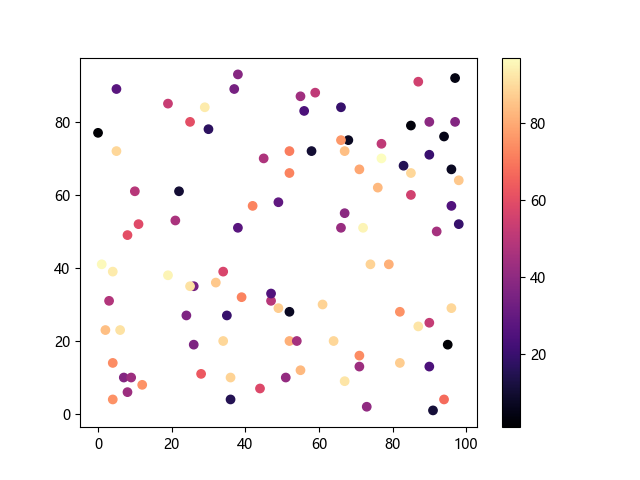 # 这三行代码使编译器能够绘图: import sys import matplotlib matplotlib.use('Agg') import matplotlib.pyplot as plt import numpy as np # 生成随机数据 x = np.random.randint(100, size=(100)) y = np.random.randint(100, size=(100)) colors = np.random.randint(100, size=(100)) # 使用 magma 配色方案绘制岩浆渐变色散点图: plt.scatter(x, y, c=colors, cmap='magma') plt.colorbar() plt.show() # 这两行代码使编译器能够输出图形: plt.savefig(sys.stdout.buffer) sys.stdout.flush()