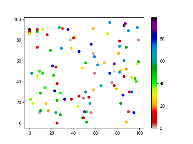 #Three lines to make our compiler able to draw: import sys import matplotlib matplotlib.use('Agg') import matplotlib.pyplot as plt import numpy as np x = np.random.randint(100, size=(100)) y = np.random.randint(100, size=(100)) colors = np.random.randint(100, size=(100)) plt.scatter(x, y, c=colors, cmap='nipy_spectral_r') plt.colorbar() plt.show() #Two lines to make our compiler able to draw: plt.savefig(sys.stdout.buffer) sys.stdout.flush()