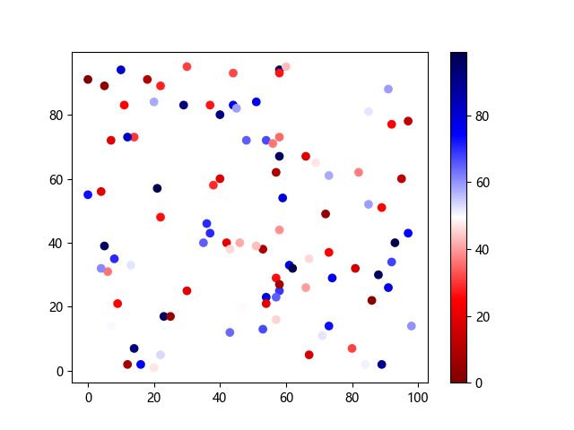 # 以下三行代码使编译器支持绘图功能: import sys import matplotlib matplotlib.use('Agg') import matplotlib.pyplot as plt import numpy as np # 生成随机数据: x = np.random.randint(100, size=(100)) y = np.random.randint(100, size=(100)) colors = np.random.randint(100, size=(100)) # 使用 seismic 反向配色方案创建散点图: plt.scatter(x, y, c=colors, cmap='seismic_r') plt.colorbar() plt.show() # 以下两行代码使编译器能够输出图形: plt.savefig(sys.stdout.buffer) sys.stdout.flush()