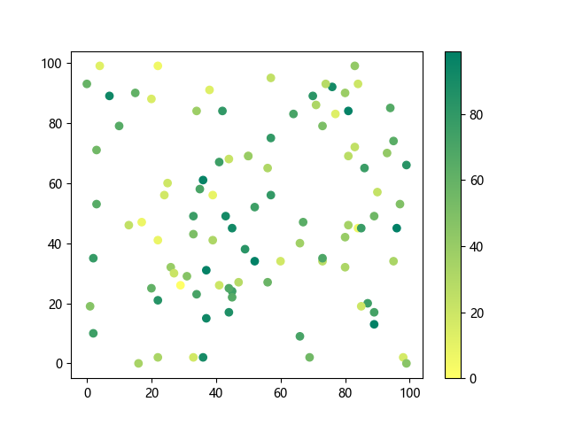 # 以下三行代码使编译器支持绘图功能: import sys import matplotlib matplotlib.use('Agg') import matplotlib.pyplot as plt import numpy as np # 生成随机数据: x = np.random.randint(100, size=(100)) y = np.random.randint(100, size=(100)) colors = np.random.randint(100, size=(100)) # 使用 summer 反向配色方案创建散点图: plt.scatter(x, y, c=colors, cmap='summer_r') plt.colorbar() plt.show() # 以下两行代码使编译器能够输出图形: plt.savefig(sys.stdout.buffer) sys.stdout.flush()