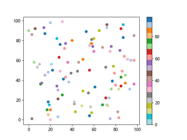 # 以下三行代码使编译器支持绘图功能: import sys import matplotlib matplotlib.use('Agg') import matplotlib.pyplot as plt import numpy as np # 生成随机数据: x = np.random.randint(100, size=(100)) y = np.random.randint(100, size=(100)) colors = np.random.randint(100, size=(100)) # 使用 tab20 反向离散配色方案创建散点图: plt.scatter(x, y, c=colors, cmap='tab20_r') plt.colorbar() plt.show() # 以下两行代码使编译器能够输出图形: plt.savefig(sys.stdout.buffer) sys.stdout.flush()