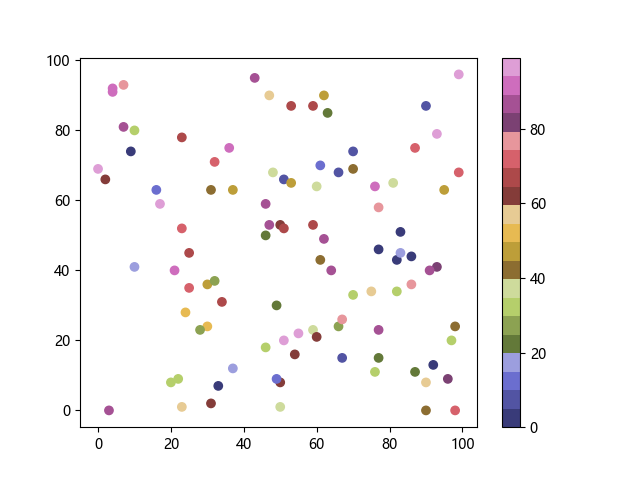 # 以下三行代码使编译器支持绘图功能: import sys import matplotlib matplotlib.use('Agg') import matplotlib.pyplot as plt import numpy as np # 生成随机数据: x = np.random.randint(100, size=(100)) y = np.random.randint(100, size=(100)) colors = np.random.randint(100, size=(100)) # 使用 tab20b 离散配色方案创建散点图: plt.scatter(x, y, c=colors, cmap='tab20b') plt.colorbar() plt.show() # 以下两行代码使编译器能够输出图形: plt.savefig(sys.stdout.buffer) sys.stdout.flush()