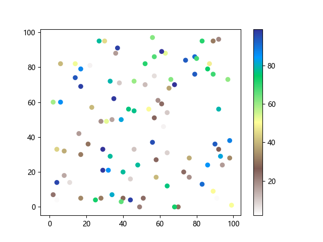 # 以下三行代码使编译器支持绘图功能: import sys import matplotlib matplotlib.use('Agg') import matplotlib.pyplot as plt import numpy as np # 生成随机数据: x = np.random.randint(100, size=(100)) y = np.random.randint(100, size=(100)) colors = np.random.randint(100, size=(100)) # 使用地形反向 (terrain_r) 配色方案创建散点图: plt.scatter(x, y, c=colors, cmap='terrain_r') plt.colorbar() plt.show() # 以下两行代码使编译器能够输出图形: plt.savefig(sys.stdout.buffer) sys.stdout.flush()