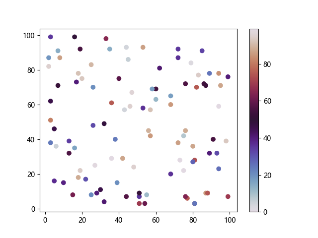 # 以下三行代码使编译器支持绘图功能: import sys import matplotlib matplotlib.use('Agg') import matplotlib.pyplot as plt import numpy as np # 生成随机数据: x = np.random.randint(100, size=(100)) y = np.random.randint(100, size=(100)) colors = np.random.randint(100, size=(100)) # 使用 twilight 配色方案创建散点图: plt.scatter(x, y, c=colors, cmap='twilight') plt.colorbar() plt.show() # 以下两行代码使编译器能够输出图形: plt.savefig(sys.stdout.buffer) sys.stdout.flush()