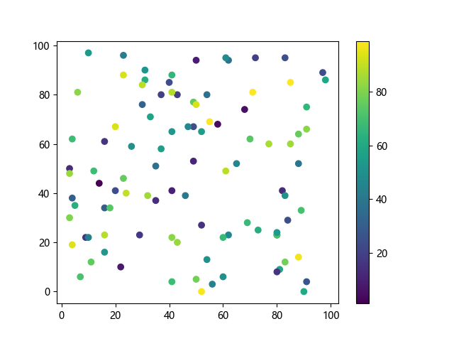 # 以下三行代码使编译器支持绘图功能: import sys import matplotlib matplotlib.use('Agg') import matplotlib.pyplot as plt import numpy as np # 生成随机数据: x = np.random.randint(100, size=(100)) y = np.random.randint(100, size=(100)) colors = np.random.randint(100, size=(100)) # 使用 viridis 配色方案创建散点图: plt.scatter(x, y, c=colors, cmap='viridis') plt.colorbar() plt.show() # 以下两行代码使编译器能够输出图形: plt.savefig(sys.stdout.buffer) sys.stdout.flush()