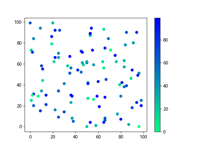 # 以下三行代码使编译器支持绘图功能: import sys import matplotlib matplotlib.use('Agg') import matplotlib.pyplot as plt import numpy as np # 生成随机数据: x = np.random.randint(100, size=(100)) y = np.random.randint(100, size=(100)) colors = np.random.randint(100, size=(100)) # 使用冬季反向 (winter_r) 配色方案创建散点图: plt.scatter(x, y, c=colors, cmap='winter_r') plt.colorbar() plt.show() # 以下两行代码使编译器能够输出图形: plt.savefig(sys.stdout.buffer) # 将图形保存到标准输出缓冲区 sys.stdout.flush() # 刷新输出缓冲区