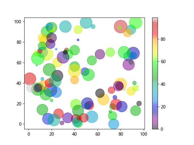 # 以下三行代码使编译器支持绘图功能: import sys import matplotlib matplotlib.use('Agg') import matplotlib.pyplot as plt import numpy as np # 生成随机数据: x = np.random.randint(100, size=(100)) y = np.random.randint(100, size=(100)) colors = np.random.randint(100, size=(100)) sizes = 10 * np.random.randint(100, size=(100)) # 点大小(10-990随机值) # 使用光谱配色、半透明效果创建散点图: plt.scatter(x, y, c=colors, s=sizes, alpha=0.5, cmap='nipy_spectral') plt.colorbar() plt.show() # 以下两行代码使编译器能够输出图形: plt.savefig(sys.stdout.buffer) sys.stdout.flush()