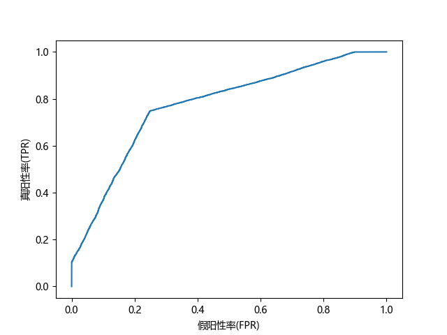 # 这三行代码使编译器支持绘图功能: import sys import matplotlib matplotlib.use('Agg') import numpy as np import matplotlib.pyplot as plt from sklearn.metrics import accuracy_score, confusion_matrix, roc_auc_score, roc_curve n = 10000 y = np.array([0] * n + [1] * n) # 生成两种概率预测值: y_prob_1 = np.array( np.random.uniform(.25, .5, n//2).tolist() + np.random.uniform(.3, .7, n).tolist() + np.random.uniform(.5, .75, n//2).tolist() ) y_prob_2 = np.array( np.random.uniform(0, .4, n//2).tolist() + np.random.uniform(.3, .7, n).tolist() + np.random.uniform(.6, 1, n//2).tolist() ) def plot_roc_curve(true_y, y_prob): """ 根据预测概率绘制ROC曲线 """ fpr, tpr, thresholds = roc_curve(true_y, y_prob) plt.plot(fpr, tpr) plt.xlabel('假阳性率(FPR)') plt.ylabel('真阳性率(TPR)') # 绘制第一种概率预测的 ROC 曲线: plot_roc_curve(y, y_prob_1) # 这两行代码使编译器能够输出图形: plt.savefig(sys.stdout.buffer) sys.stdout.flush()